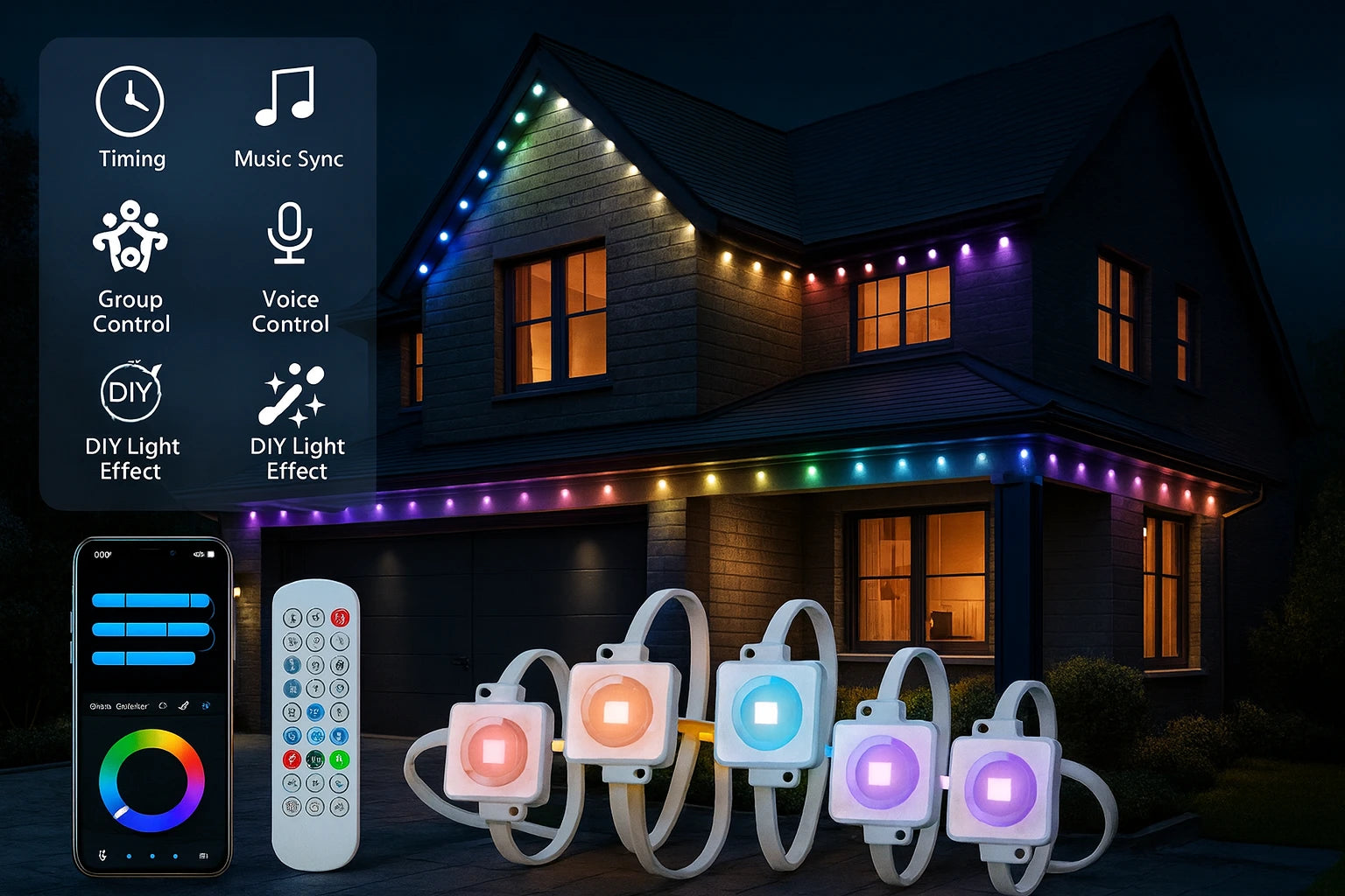 100FT Permanent Outdoor Eaves LED Lights - 60 RGB LEDs - Waterproof String Lights - DIY Programmable Holiday Lighting