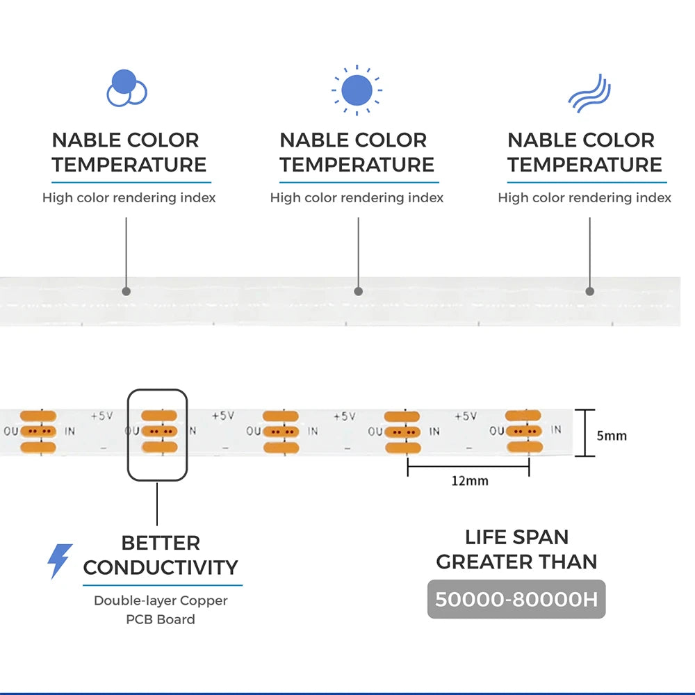 • Ultra High Density - 240 LEDs per meter provides exceptional brightness and smooth color transitions without visible gaps