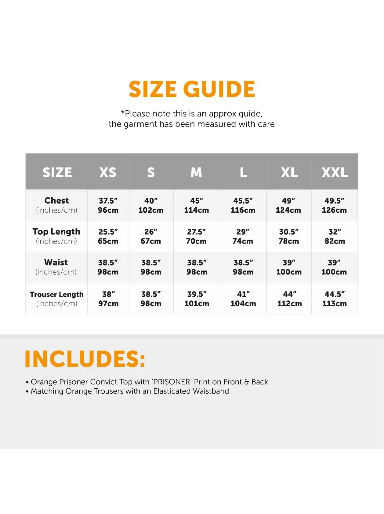 AVAILABLE IN MULTIPLE SIZES: Our Adults Prisoner Costume is available in multiple sizes from X-Small – XX-Large: X Small: Chest: 37.5" (96cm), Top Length: 25.5" (65cm), Waist: 38.5" (98cm), Trouser Length: 38" (97cm) | Small: Chest: 40" (102cm), Top Length: 26" (67cm), Waist: 38.5" (98cm), Trouser Length: 38.5" (98cm) | Medium: Chest: 45" (114cm), Top Length: 27.5" (70cm), Waist: 38.5" (98cm), Trouser Length: 39.5" (101cm) | Large: Chest: 45.5" (116cm), Top Length: 29" (74cm), Waist: 38.5" (98cm), Trouser Length: 41" (104cm) | X Large: Chest: 49" (124cm), Top Length: 30.5" (78cm), Waist: 39" (100cm), Trouser Length: 44" (112cm) | XX Large: Chest: 49.5" (126cm), Top Length: 32" (82cm), Waist: 39" (100cm), Trouser Length: 44.5" (113cm)