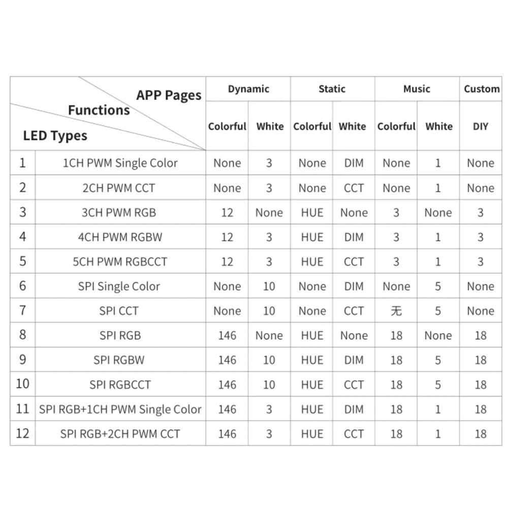 SPI/Addressable Mode: WS2811, WS2812B, WS2813, SK6812, SK6812RGBW, UCS1903, TM1804, TM1809, TM1812, INK1003, and other addressable IC chips