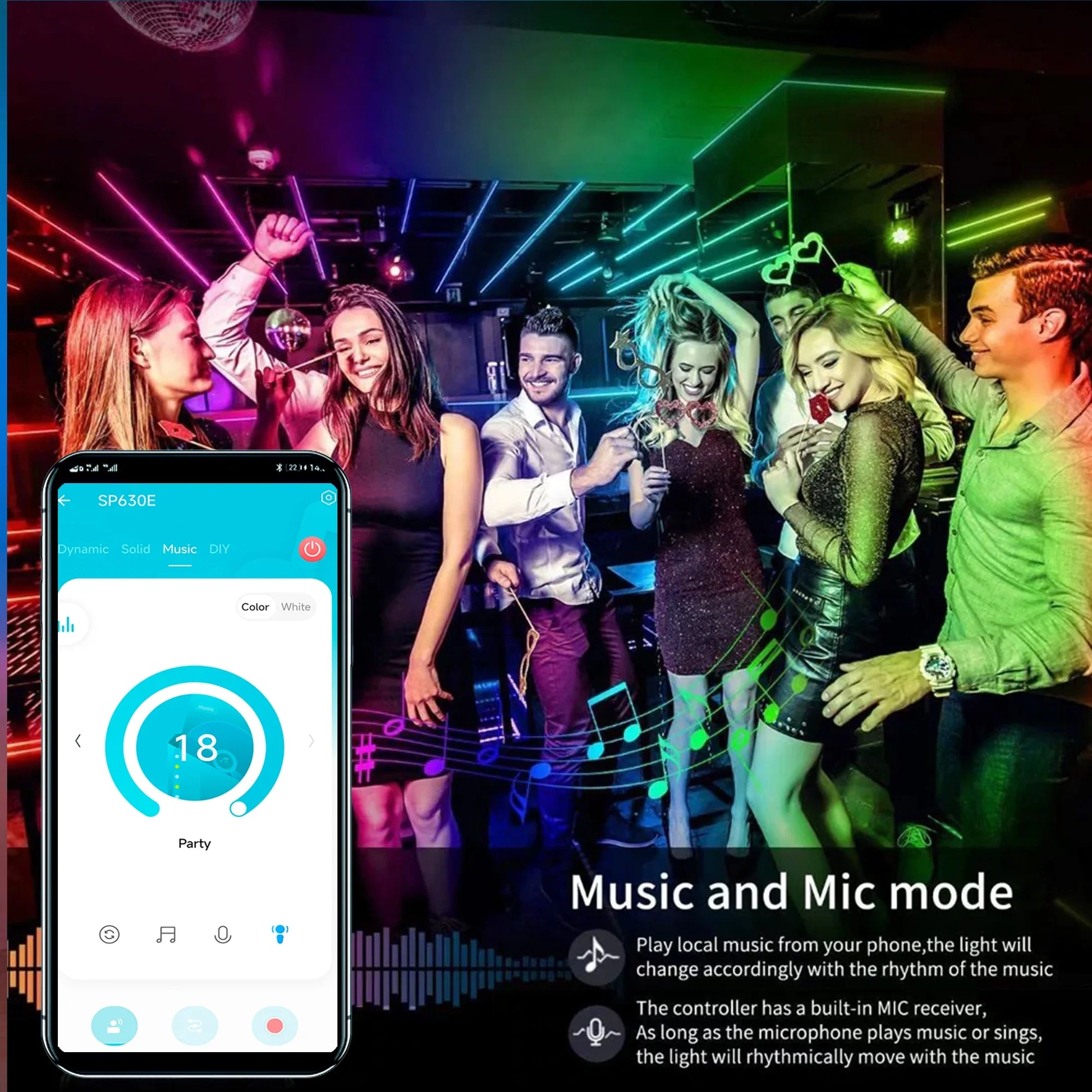 - Music Sync: Built-in microphone for sound-reactive effects